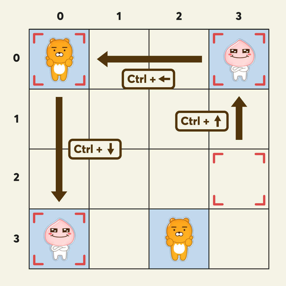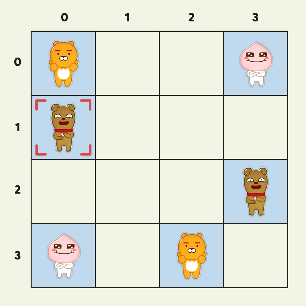 - 게임 화면의 좌측 상단이 (0, 0), 우측 하단이 (3, 3) 입니다.