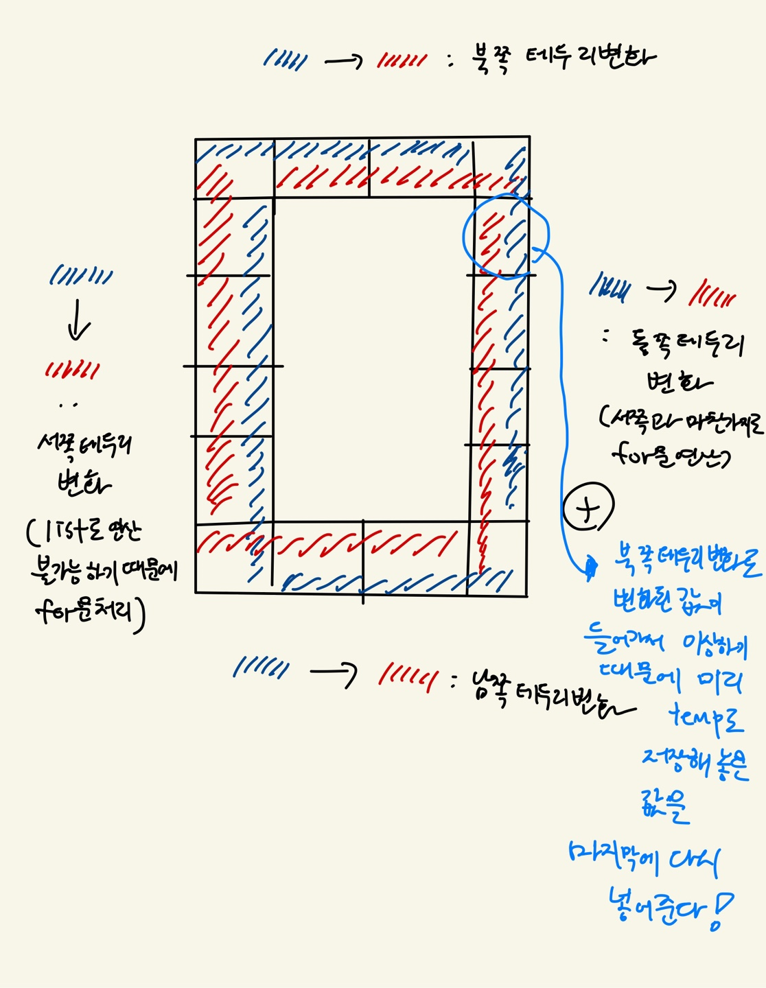 아래와 같이 순서대로 테두리 변화를 파란색에서 빨간색으로 진행하는데 마지막 동그라미 표시를 보면 북쪽 테두리로 변한 값이 동쪽 테두리변화에서 값으로 들어가기 때문에 처음에 미리 값을 지정해놓고 나중에 다시 값을 넣어주는 작업이 필요합니다