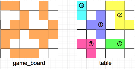 - 즉, 테이블은 game_board와 같은 크기의 정사각 격자 모양입니다.