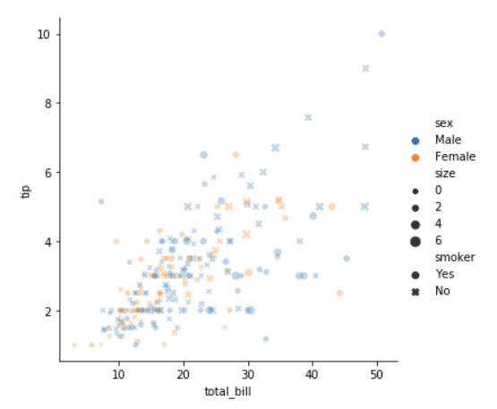 sns.relplot(x="total_bill", y="tip", hue='sex', style='smoker', size='size', alpha=0.3, data=tips)