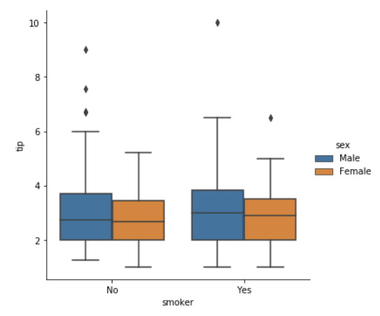 sns.catplot(x="smoker", y="tip", kind='box', order=["No", "Yes"], hue='sex', data=tips)