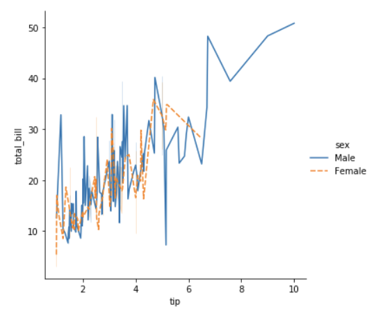 sns.relplot(x="tip", y="total_bill", hue='sex', style='sex', data=tips, kind='line')