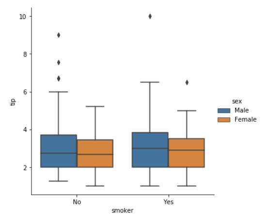 sns.catplot(x="smoker", y="tip", kind='box', order=["No", "Yes"], hue='sex', data=tips)