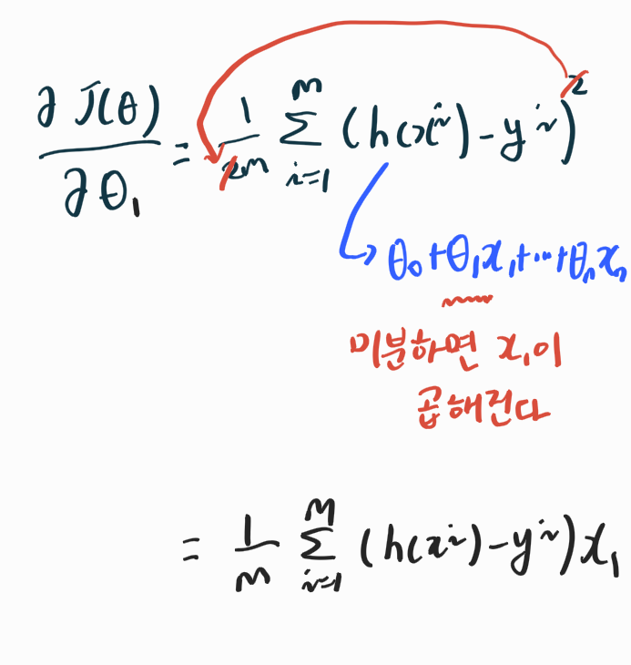 미분에 대해서 잘 모르는 사람을 위해서 부족하지만 θ₁에 대한 편미분 예시입니다.