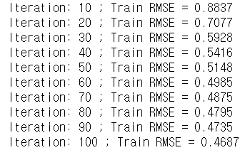 print("Iteration: %d : Train RMSE = %.4f " % (i+1, rmse))