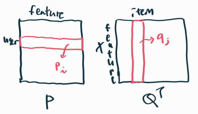 $$\hat{r_{ij}} = p_{i}^{T}q_{j} = \sum_{k=1}^{K}p_{ik}q_{kj}$$