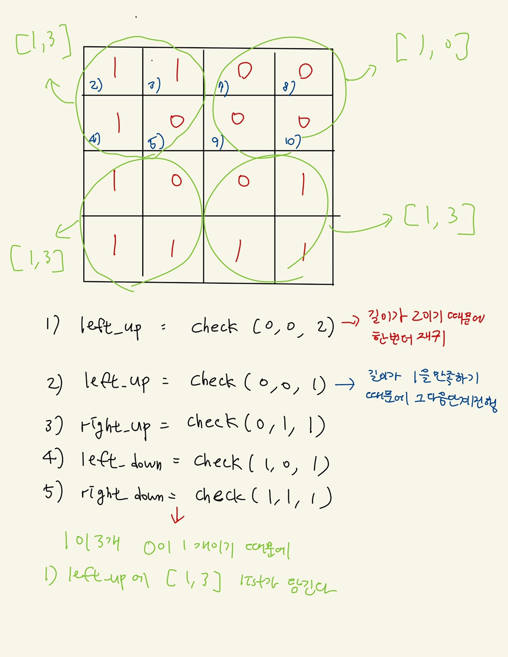 재귀함수를 이용해서 왼쪽위의 정사각형이 길이가 1인 셀이 될때까지 만든 이후에 개수를 카운트 해주는 것이다.