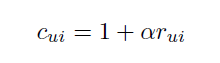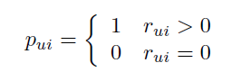 먼저 ALS에서는 0과 1의 값을 가지는 이진변수인 P_ui를 도입했다. P_ui는 user u가 item i를 선호하는것을 나타내는것이다. 이 값은 한 user가 해당 item에 대해서 소비한적이 존재한다면 1로 표시하고 한번도 소비한적이 없었다면 0으로 나타내는 것이다.
