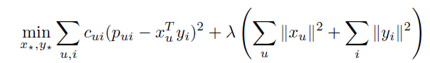 해당 논문에서 사용한 ALS 알고리즘은 결국 관찰된 아이템에 의해서만 Loss function에 영향을 주는 것이 아니라 관찰되지 않은 아이템에 대해서도 Loss function에 영향을 주게 만들었다. 결국 제안하는 Loss function은 아래와 같다.