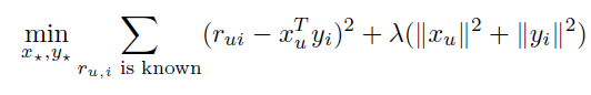 기존 특이값 분해의 Loss function이다. r_ui의 경우 기존의 user-item matrix의 특정 user u에 대한 특정 item i의 평점값이 된다. x_u는 user-latent matrix이고 y_i는 item-latent matrix이다. 둘 사이의 내적을 원본 행렬과 차이를 최소화 시키는 방향으로 SGD를 통해 update하는것이다. 자세한 내용은 저의 블로그 SGD를 이용한 matrix factorization을 참고해주세요! 뒤에는 regularization term을 이용해 과적합을 방지해주었다.